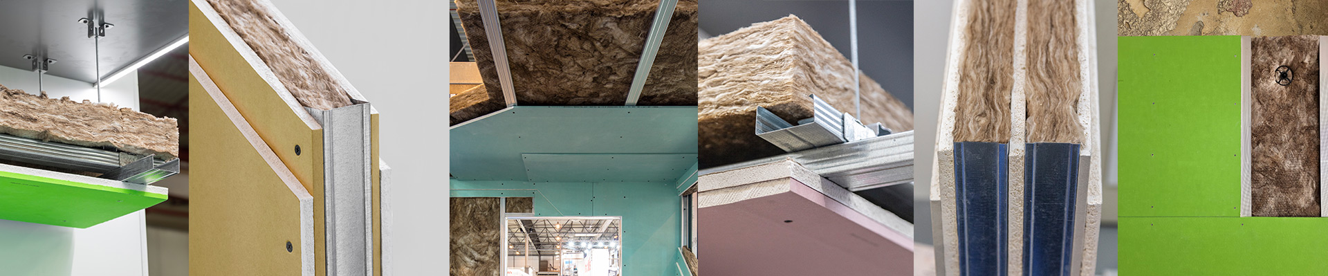Utilizar a lã mineral Volcalis (material absorvente) revestida com placas de gesso Gyptec é uma excelente solução para resolver problemas relacionados com ruído e melhorar o comportamento acústico de um local, já que permite a combinação dos dois produtos com desempenhos acústicos e a placa de gesso ainda permite fazer o acabamento final de forma simples.